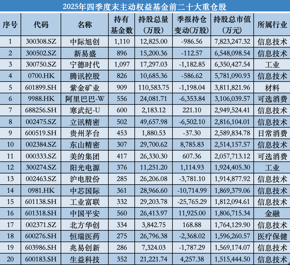 新面孔突围!中际旭创超越宁德时代,登顶主动权益基金去年末第一重仓股