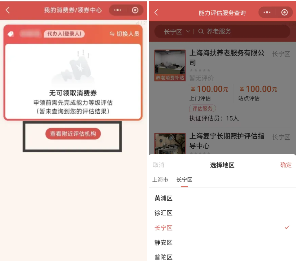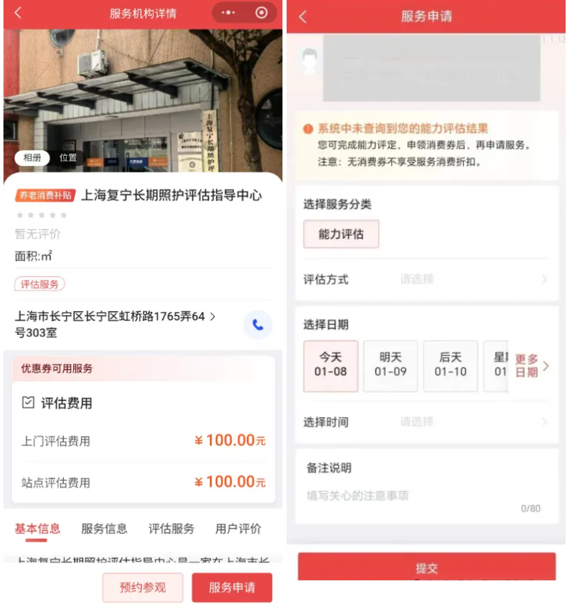 系统会显示您所在区域附近的评估机构列表供您选择,点击相应评估机构的“服务申请”按钮,选择评估方式,预约时间,点击提交。当您被评估为中度以上能力等级后,重复步骤二可领取消费券。
