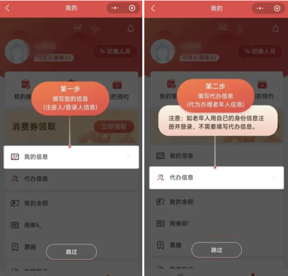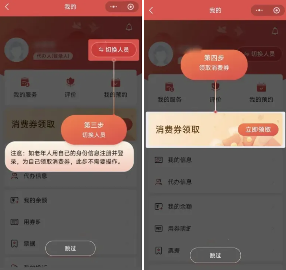 按要求准确填写“我的信息”“代办信息”,完成信息填写并提交后,点击“切换人员”进行切换。点击“立即领取”即可领取消费券。