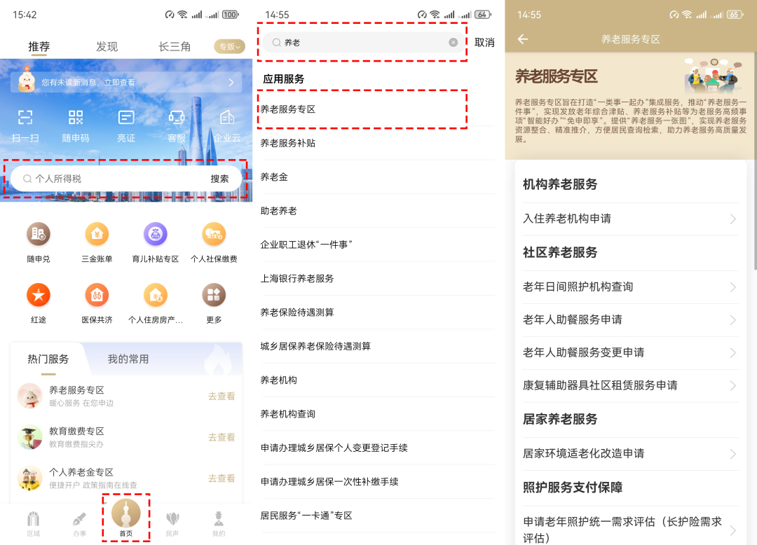 登录“随申办市民云”APP→在首页搜索框中输入“养老”→点击“养老服务专区”即可进入专区页面。