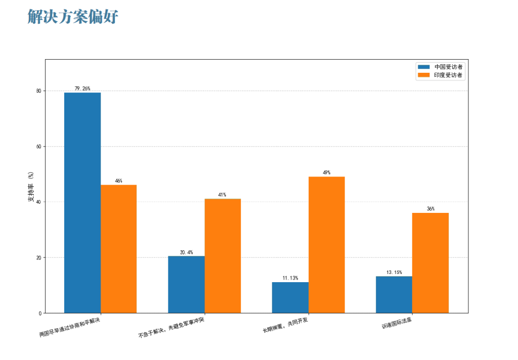 在回答该如何解决中印两国领土争端时,有79.26%的中国受访者选择“两国应尽早通过协商争取和平解决”;选择“不急于解决,先回避偶然的军事冲突”的达到20.4%;选择“长期搁置,实现共同开发”的为11.13%。相比之下,有49%的印度受访者选择“长期搁置,实现共同开发”,有46%选择“两国应尽早通过协商争取和平解决”,有41% 选择“不急于解决,先回避偶然的军事冲突”。此外,还分别有13.15%的中国受访者和36%的印度受访者选择了“诉诸国际法庭”的选项。