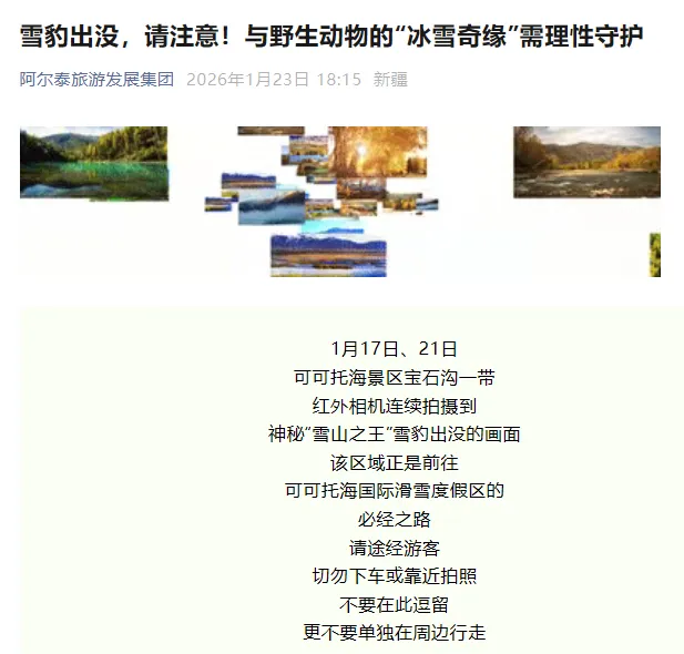 记者注意到,当日阿尔泰旅游发展集团官方账号发布了宝石沟一带有雪豹出没的消息: