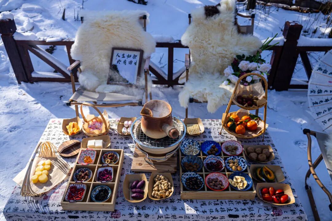 然后在木屋旁、雪地里架起小火炉