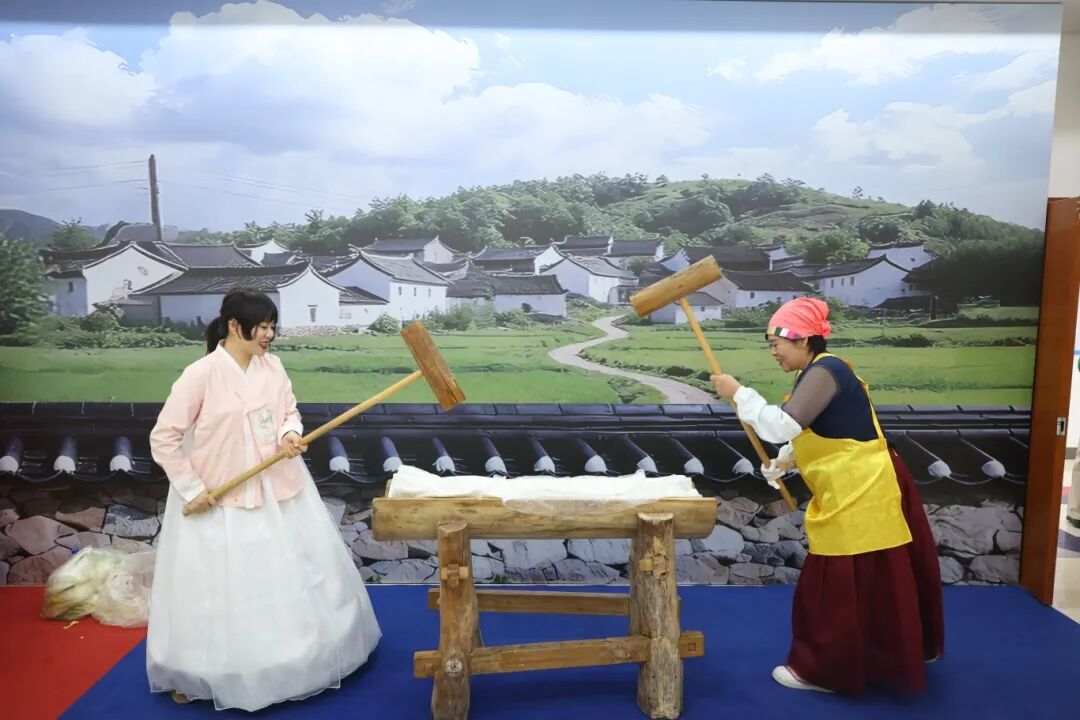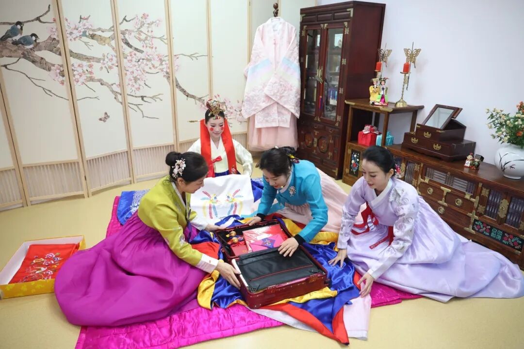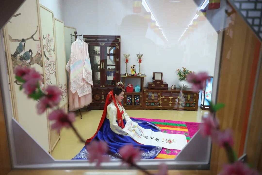 大厅是“新郎家”的喜堂,展馆核心区成为庄重的主礼区,辅以民俗美食、趣味游戏等互动空间,让人进门即穿越——市民、游客换装朝鲜族传统服饰,成为婚礼“宾客”,在“司仪”引导下,全程参与纳采、迎亲、醮礼、交拜、宴饮等婚礼环节。