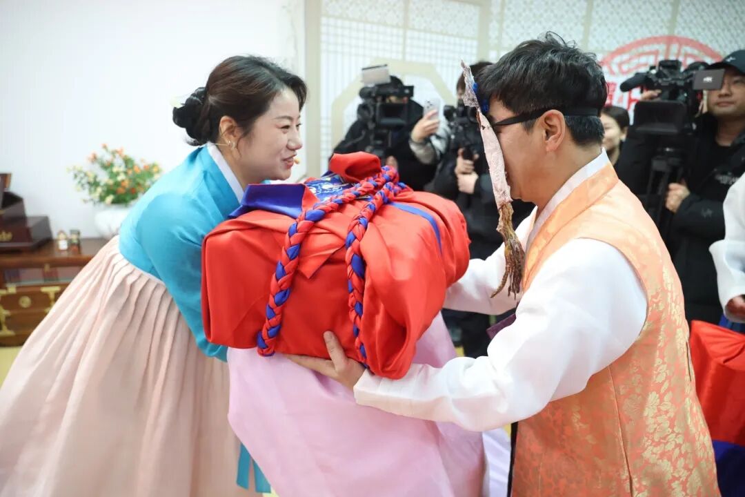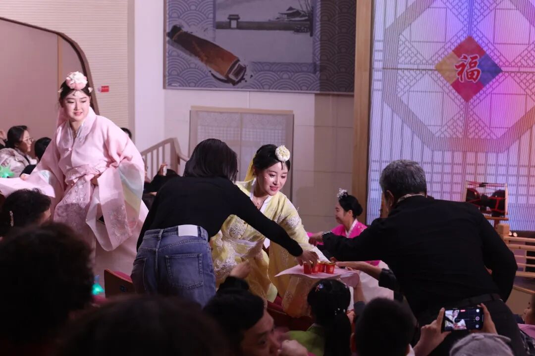 婉转诉乡情的伽倻琴弹唱《桔梗谣》,欢腾的象帽舞《迎春谣》展现家族喜悦,幽默温馨的奶奶天团舞蹈《阿里郎》传递跨代祝福,象征姻缘美满的新人鼓舞《鼓之缘》……这些情感丰沛的歌舞盛宴更是将现场的气氛推向了高潮。