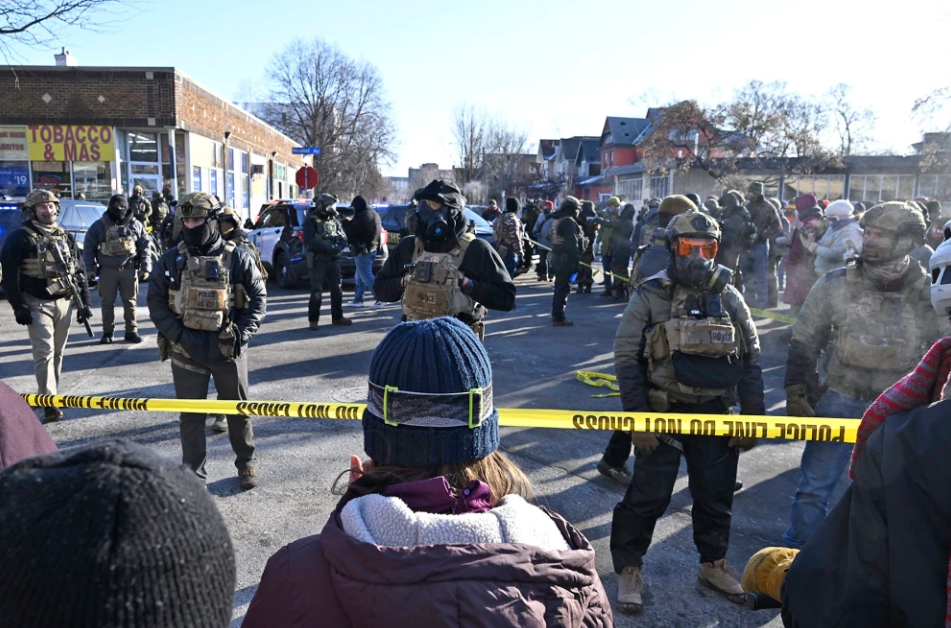 当地时间24日,明尼阿波利斯市,联邦执法人员封锁了枪击现场。