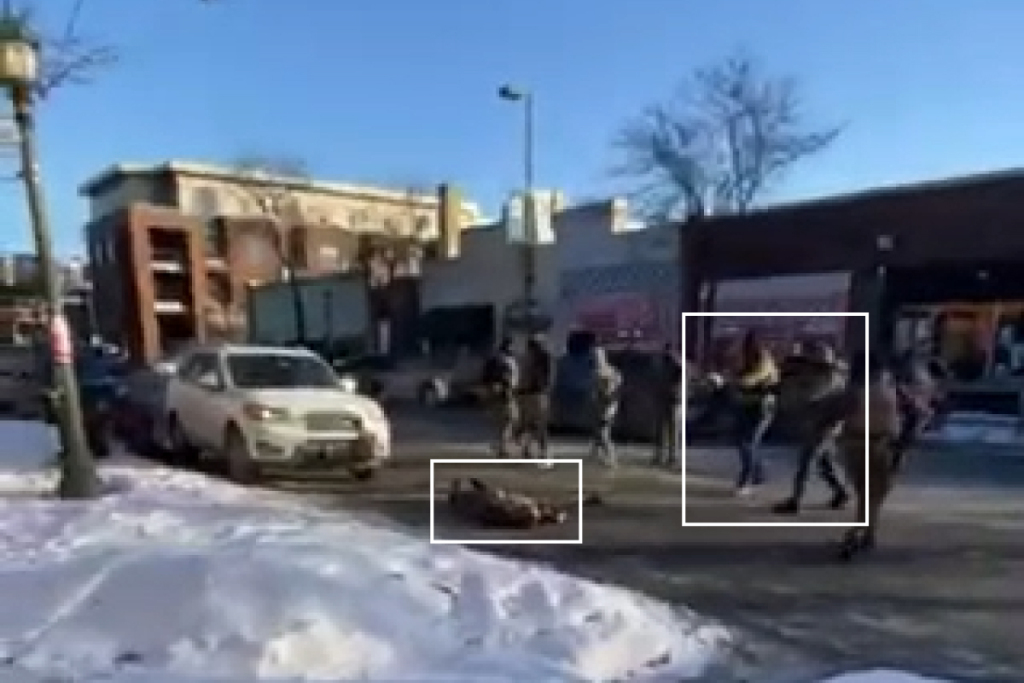 视频显示,执法人员在5秒之内至少开了10枪。到第10声枪响时,那名带着缴获武器离开的执法人员已经穿过了马路。