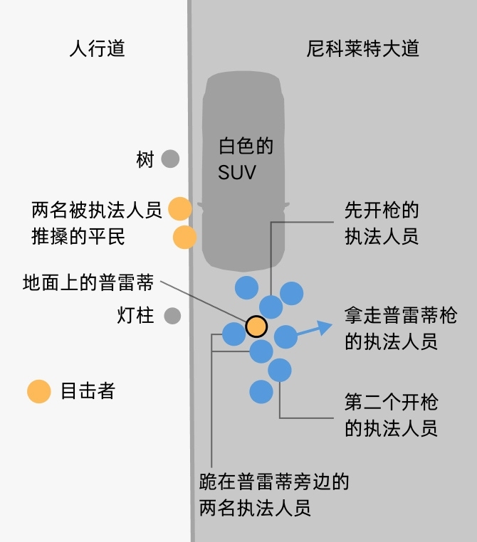 所有执法人员迅速远离倒地的普雷蒂。一名执法人员——此前把平民推到街边并向普雷蒂先生喷洒辣椒水的那名执法人员——拔出枪,向普雷蒂开火。另一名执法人员也补了几枪,两人随后又向倒在地上一动不动的普雷蒂开了6枪。