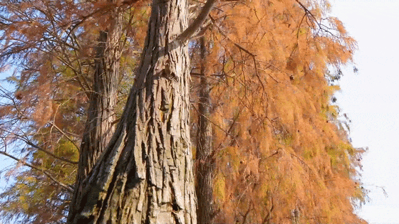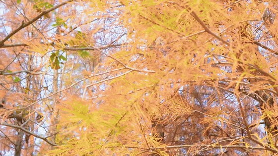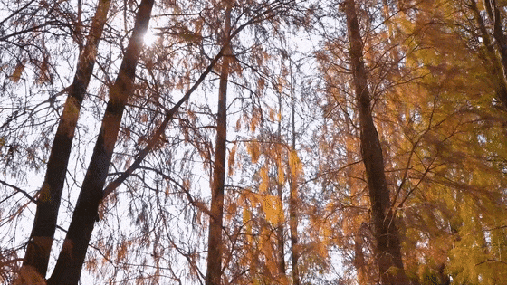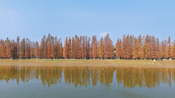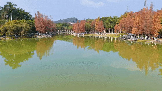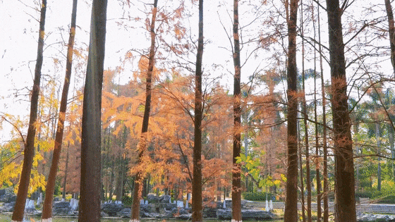 在开平市人民公园,成排的落羽杉高大挺拔,在蔚蓝天空映衬下格外壮观。湖水倒映着焦糖、橙红与锈金交织的树影,笔直树干在水中划出几何线条,恍若莫奈调色盘倾泻的秘境。步道上有不少落叶,每走一步都发出细微的声响,仿佛是大地在轻声回应着人们的脚步。不少市民趁着闲暇时光,到这里漫步、拍照,用镜头记录下这难得的美景。