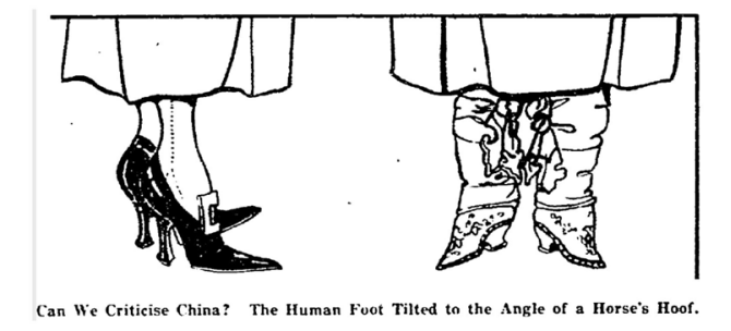 1919年,《纽约时报》(New York Times)报道了一场围绕“理性鞋履运动”展开的医学会议。编辑在报道中直言不讳地批评当时风靡美国都市的高跟鞋与尖头鞋,认为它们对女性身体造成的伤害,并不亚于中国的缠足。文章提出了一个颇具冲击力的比喻:高跟鞋,是“美国版的缠足”。该文还配上题为《我们能否批评中国》的插图,指出中国的传统缠足与美国的“荒谬”(nonsensical)鞋履之间存在惊人的相似之处:鞋型狭窄紧束、足弓被迫弯曲、鞋尖尖细(图1)。