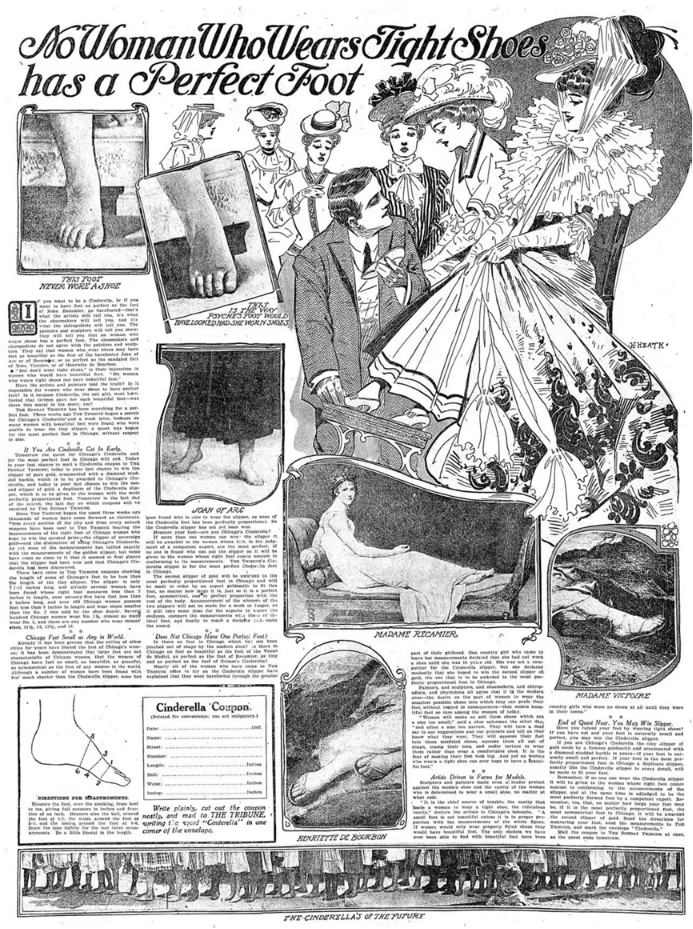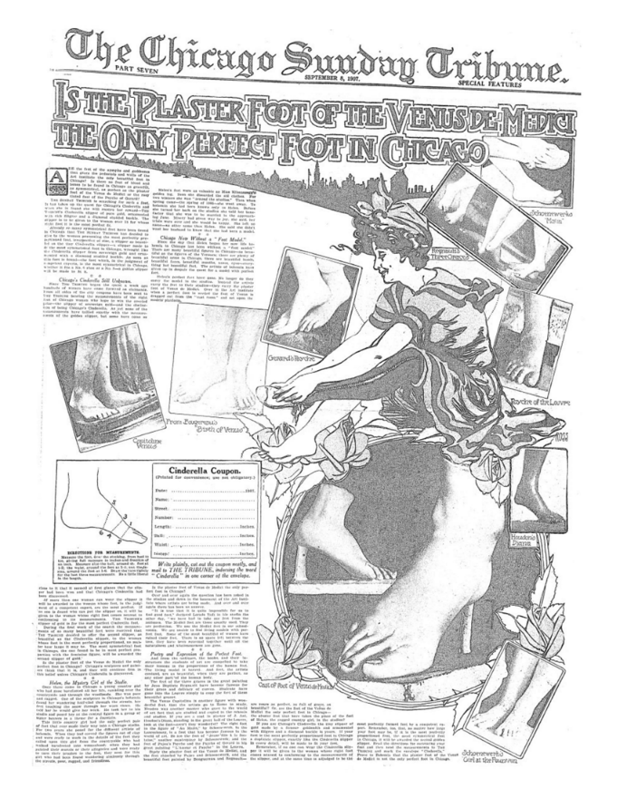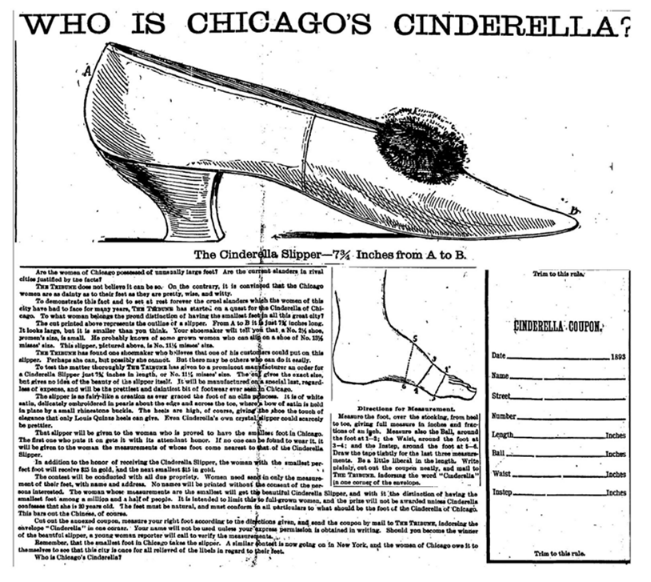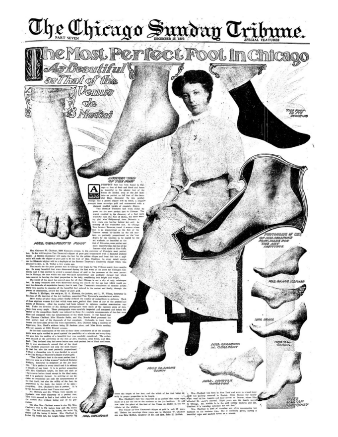 1893年,《芝加哥论坛报》(Chicago Tribune)举办了一场规模空前的“芝加哥灰姑娘”比赛。此时,芝加哥哥伦布博览会正在举行,这座新兴工业城市急于在全国乃至世界舞台上证明自身的现代性。在围绕世博会举办权展开的城市角逐中,现代性不仅体现在工业实力与城市景观上,也被投射到市民的身体之上,女性的足部成为芝加哥与纽约媒体舆论战的重要载体。1889年,丽纳·A.迈克尔斯(Rena A. Michaels)教授在一次面向热衷参与世博会的芝加哥女性的幽默演讲中指出,纽约媒体对芝加哥的“最后一击”,将会是宣称“芝加哥女性的脚大得惊人”(“Their Hearts Are In It,” Chicago Tribune, 26 October 1889.)。事实上,在这一公开调侃之前,芝加哥作为美国“大脚女性之城”(city of big-footed women)的形象,已在全国范围内流传。