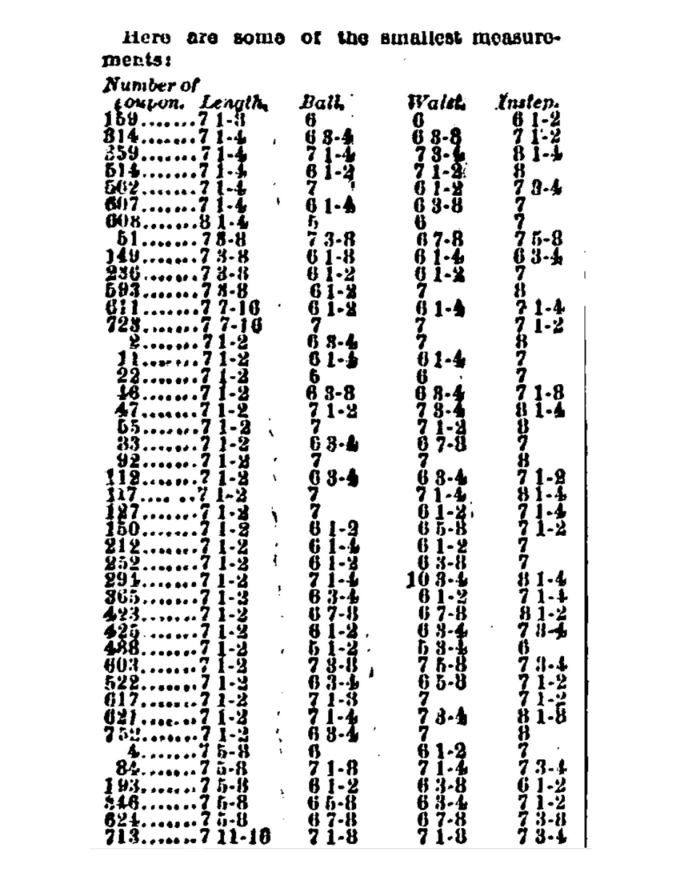 图7:部分最小足部尺寸的数据汇总,《芝加哥论坛报》,1893年2月12日。