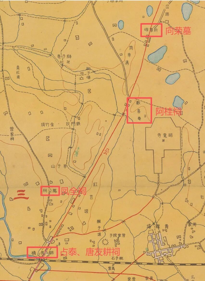这些武将(向荣、占泰、唐友耕、阿桂)有一个共同点即均任职过四川提督,这里唯一例外是凤全,不过他曾任职副都统,官阶与四川提督同为从二品,且他的祠堂也并未位于北大路正路,而是偏向了一旁的侧路以作区分。从1951年《成都市区地图》中的标识可知沿着北大路依次排列占泰、唐有耕、凤全、阿桂、向荣等武将祠墓。