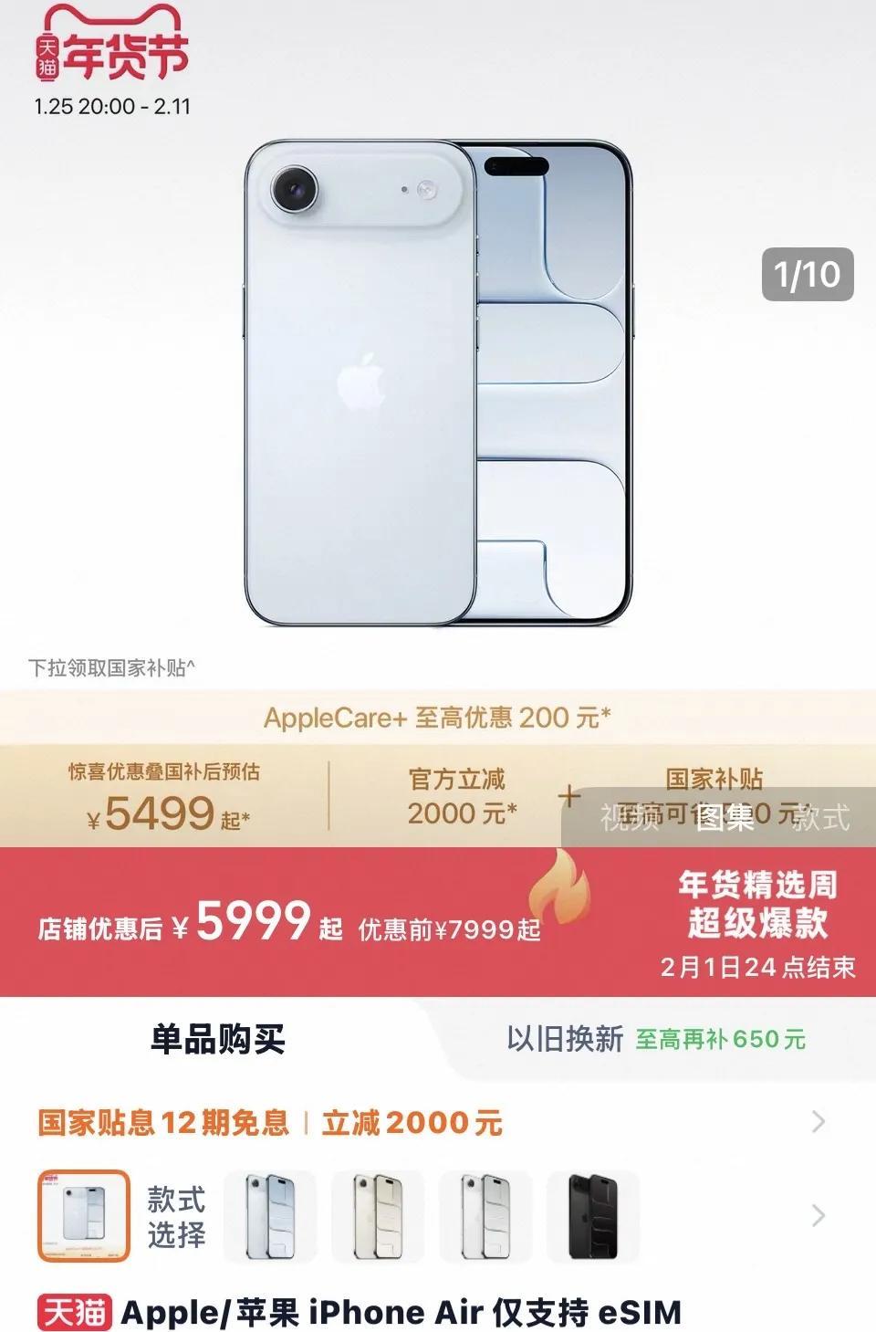 在苹果天猫官方旗舰店内,这款2025年10月22日才正式发售,厚度仅有5.6毫米、重165克的iPhone Air,官方立减2000元,叠加部分地区国补后,到手价仅5499元起。