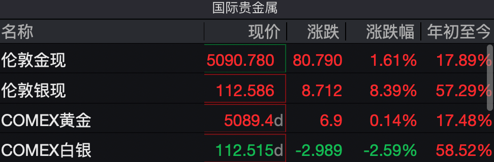 截至发稿,伦敦金现报5090.78美元/盎司,日内涨1.61%,年初至今涨幅已超17%;COMEX黄金报5089.4美元/盎司,涨0.14%,年初至今涨幅也超17%。