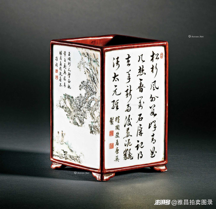 清乾隆 唐英亲制仿木纹釉开光设色山水诗文唱和四方笔筒