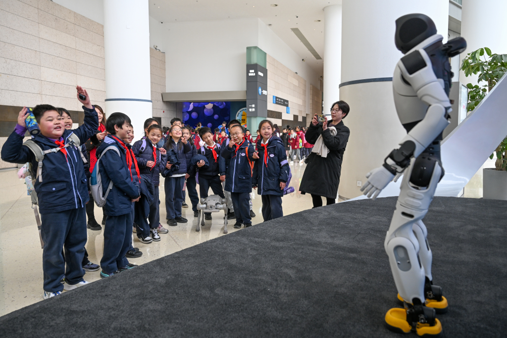 一群小学生被机器人和机器狗吸引。澎湃新闻记者 朱伟辉 图
