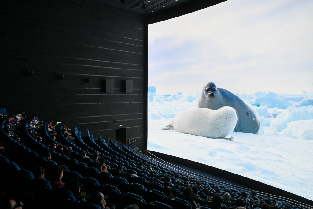 游客在巨幕影院中观影。巨幕影院是全球首个应用CLED的科技馆影院,采用中国自主研发的CINITY LED(CLED)放映系统,集成了4K、3D、高亮度、高帧率等七大顶尖技术。采用全透声屏黑科技,屏幕厚度仅2毫米,透声率超高,声画合一。澎湃新闻记者 朱伟辉 图
