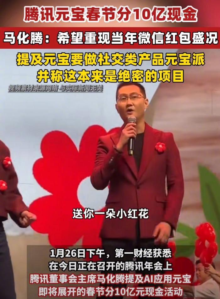 日前的腾讯年会上,腾讯董事会主席马化腾宣布AI应用元宝即将展开春节分10亿元现金红包活动。