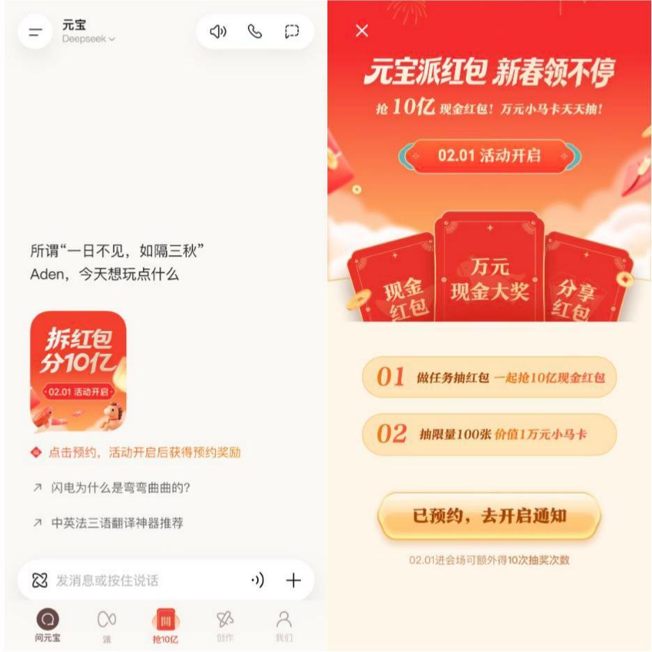 据元宝官方信息,其分10亿元现金的春节活动将于2月1日正式开启,做任务可增加抽红包次数,单个红包最高1万元。目前,元宝App已开启活动预约。