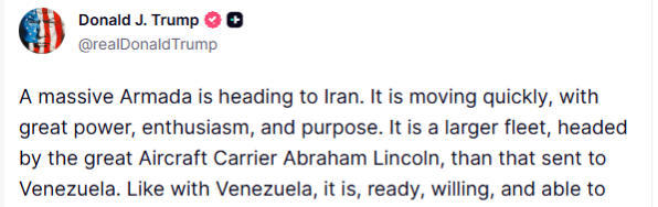 美中央司令部更是在特朗普首次发声威胁的当日放出消息,称美军“亚伯拉罕·林肯”号航空母舰打击群已驶入中东水域,并在次日宣布将举行空军战备演习。