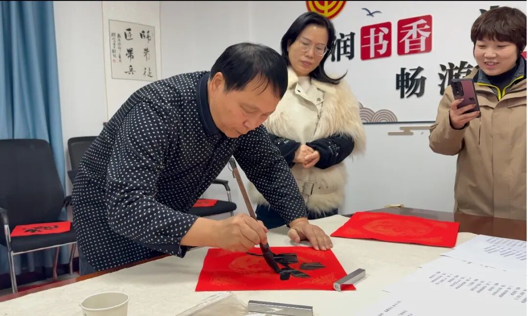 活动现场翰墨飘香、暖意融融。上午九点,职工们已有序等候,书法老师们铺纸研墨,凝神运笔,以笔传情。笔锋起落间,一幅幅吉祥春联跃然纸上,颜体雄浑厚重、柳体清劲挺拔、欧体端庄俊朗,各呈风骨,形态各异的“福”字雄浑灵动,红底黑字间满是年味与温情。