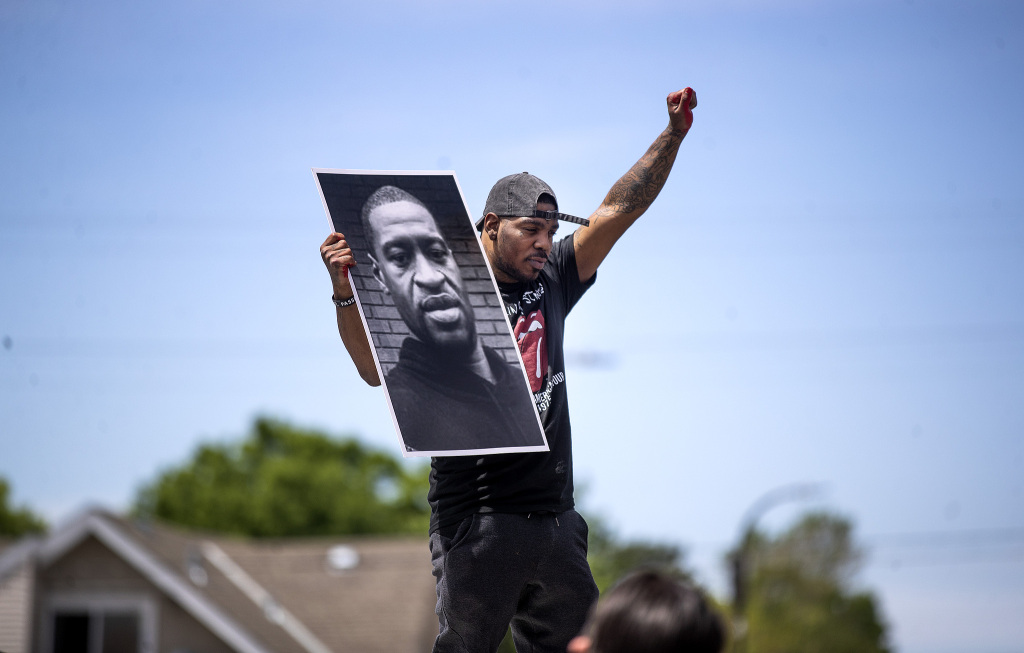 当地时间2020年5月28日,美国明尼苏达州明尼阿波利斯,一名男子手持乔治·弗洛伊德的照片,在他的遇难地点示威。视觉中国 图