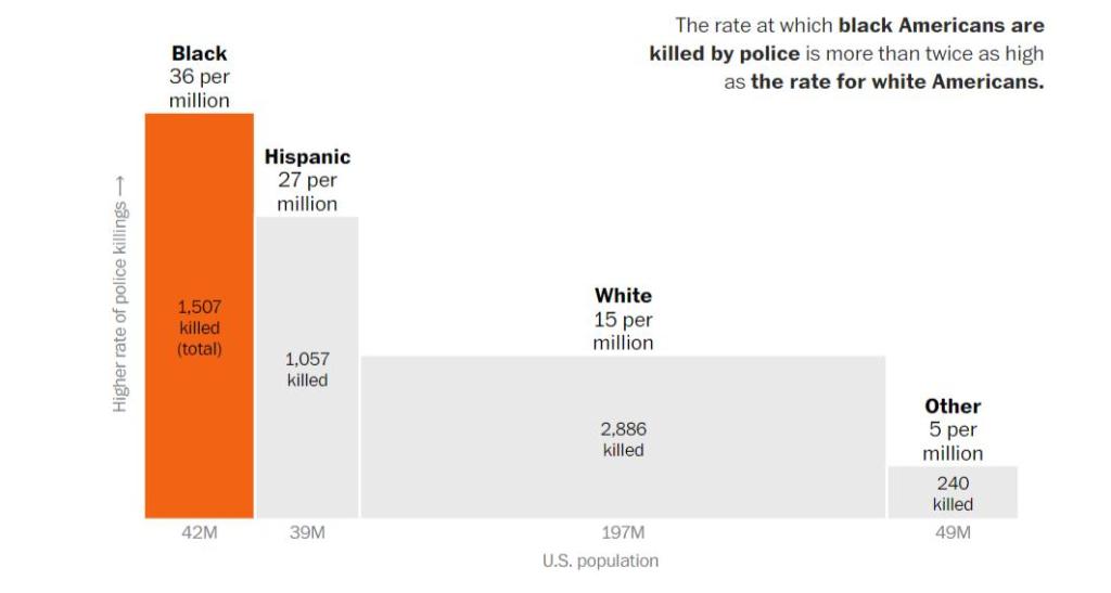 黑人死于警察枪下的概率远高于白人(图中四个柱形条表示,被警察杀死的族裔人数占该族裔总人数的比例,从左向右分别是黑人、拉美裔、白人、其他族裔)。