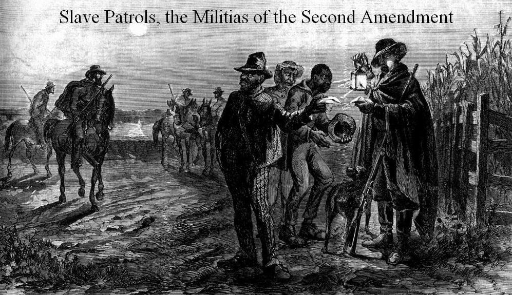 “奴隶巡逻队,(宪法)第二修正案保护的民兵”。美国宪法第二修正案允许公民有携带武器的自由,南方奴隶主借此组织起武装民兵,维持治安,抓捕逃亡黑奴。