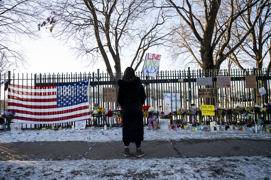 1月25日,明尼苏达州明尼阿波利斯市居民在寒风中悼念被枪杀的亚历克斯·普雷蒂。前一天,37岁的普雷蒂被美国执法人员枪杀。美国国土安全部发言人称,普雷蒂当时携手枪靠近正在执勤的联邦执法人员,后者遭“暴力抵抗”后“防卫性开枪射击”。然而,目击者拍摄的视频很快拆穿谎言:普雷蒂手中拿着手机,没有画面显示他持有武器。