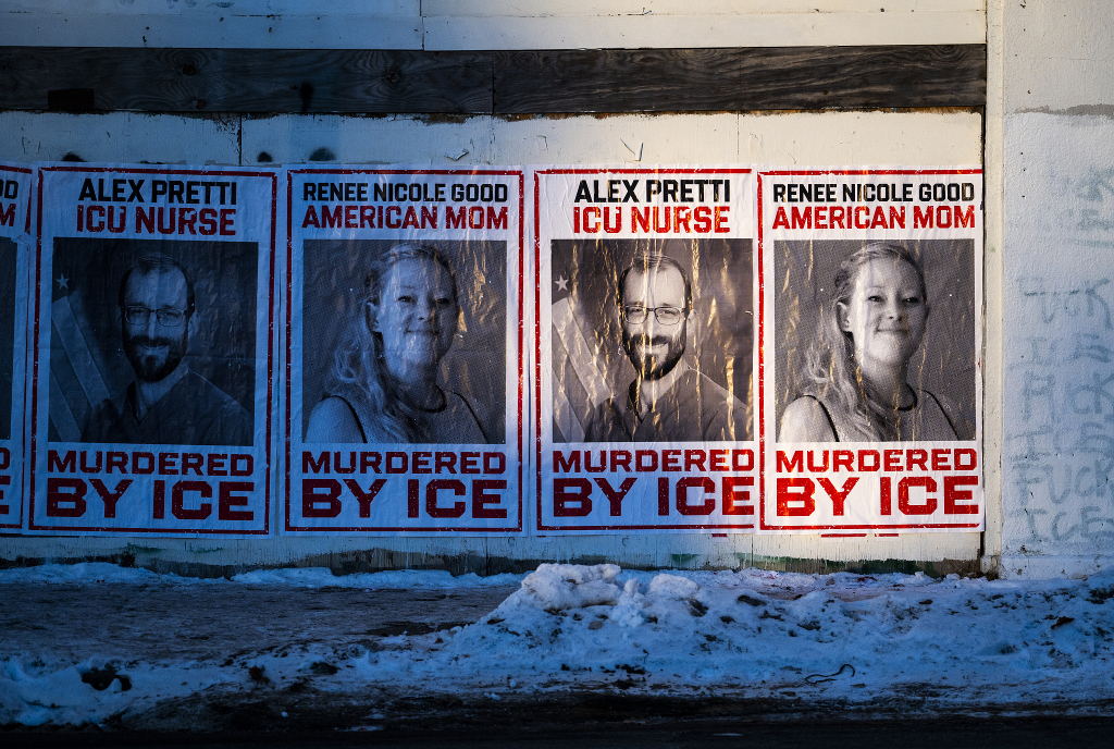 当地时间2026年1月29日,美国明尼苏达州明尼阿波利斯,联邦移民执法人员枪杀的普雷蒂和古德海报被贴在一栋建筑的墙上。视觉中国 图