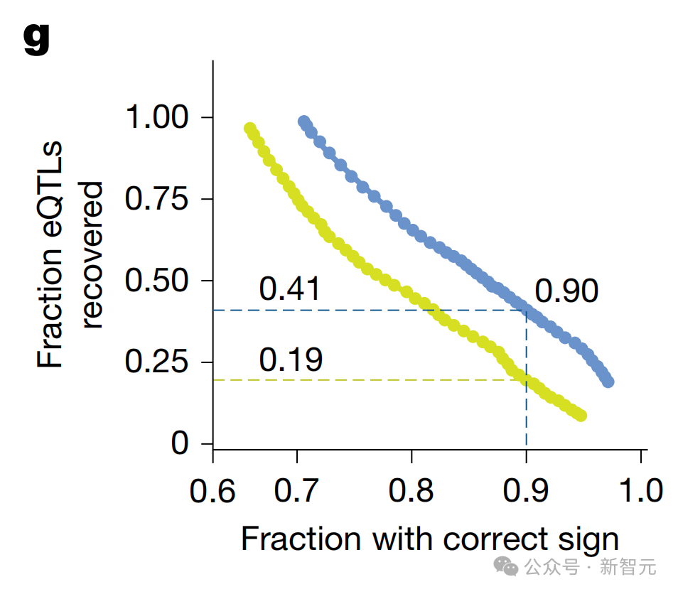在90%的准确率下,之前的最佳模型发现了19%已知变异位点,AlphaGenome直接找出了41%,性能足足提升一倍多。