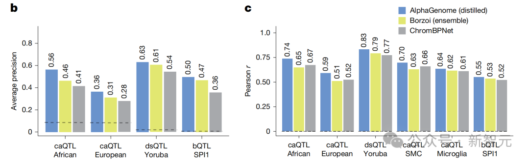 而在这一领域的七项权威基准测试中,AlphaGenome在其中6项都拿到了第一,完全碾压了现有的工具。