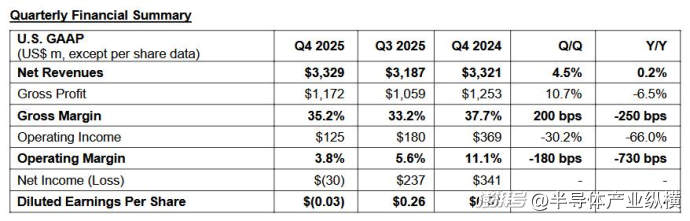 今日,意法半导体公布2025财年第四季度及全年财务业绩,数据显示2025年第四季度净收入33.3亿美元;毛利率35.2%;营业利润1.25亿美元,其中包括与减值、重组费用和其他相关逐步淘汰成本相关的1.41亿美元。2025财年净收入118亿美元;毛利率33.9%;营业收入1.75亿美元,其中包括与减值、重组费用和其他相关逐步淘汰成本相关的3.76亿美元。