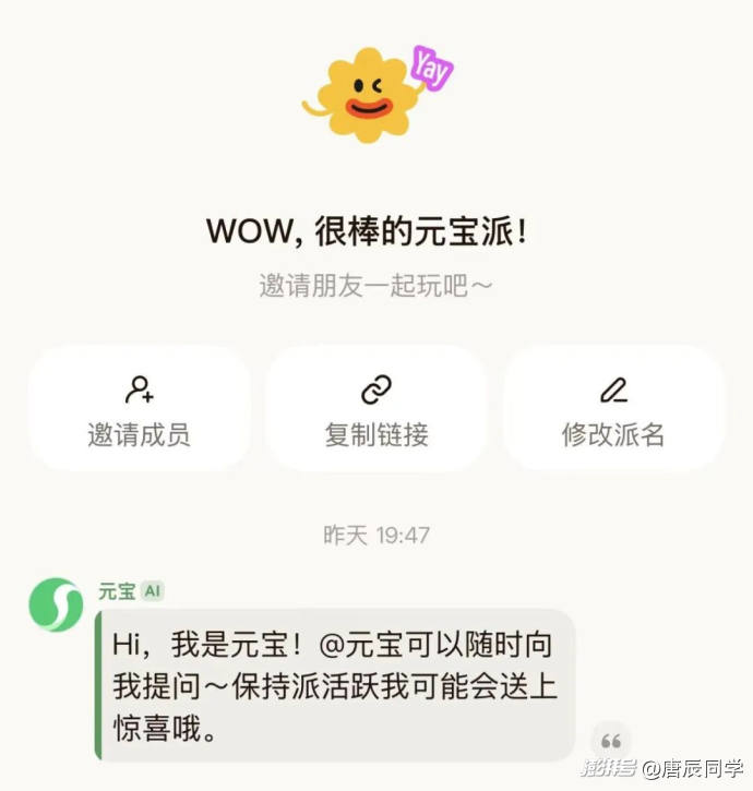接下来,腾讯应该会在自身擅长的领域持续发力。正如,元宝App近期开始内测新功能“元宝派”,用户可以创建一个“派”,或者加入一个已有的“派”,让AI参与聊天、调节氛围、执行任务等。这被视为腾讯在“AI+社交”上的关键尝试。
