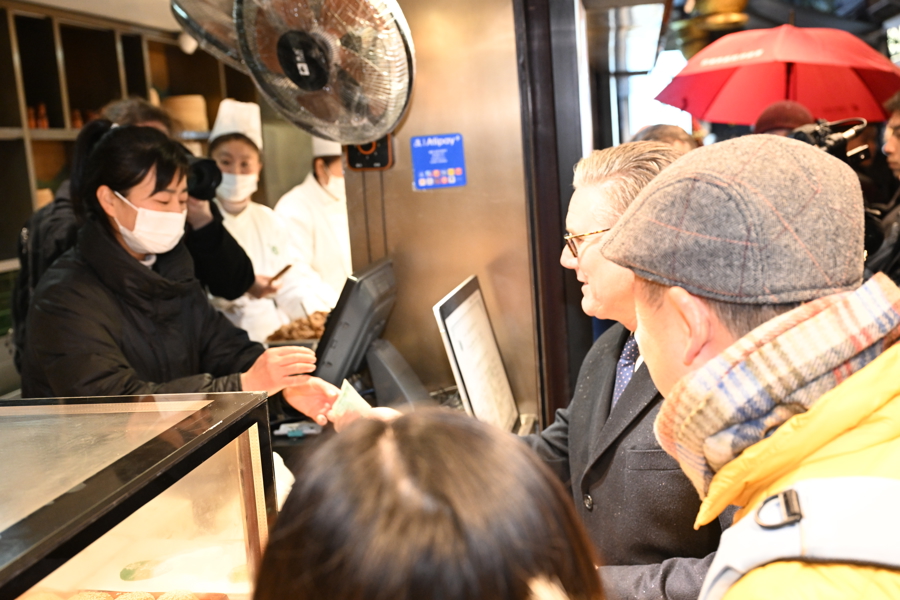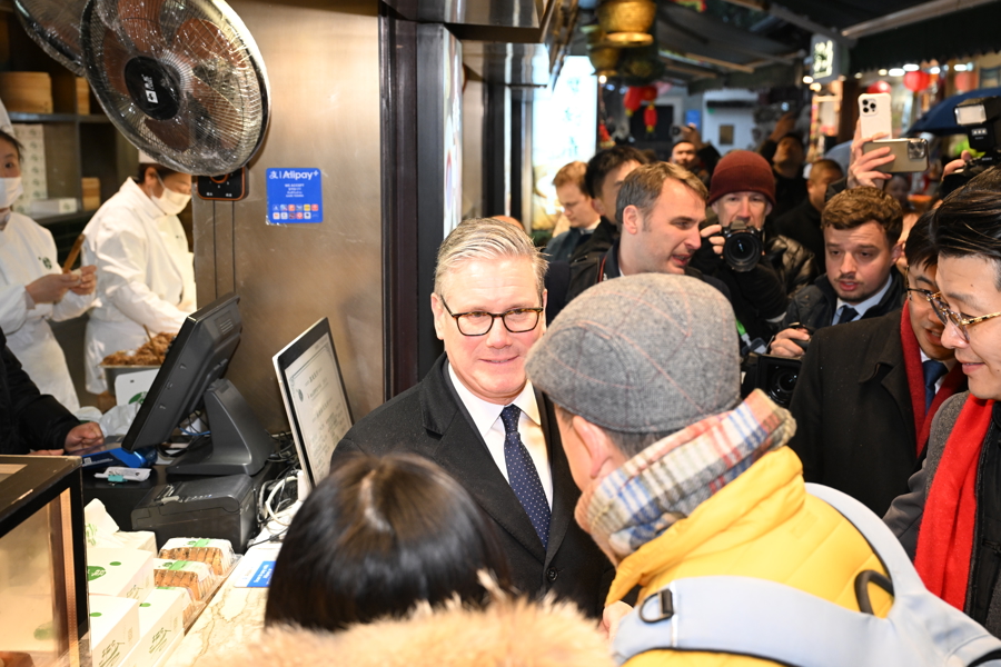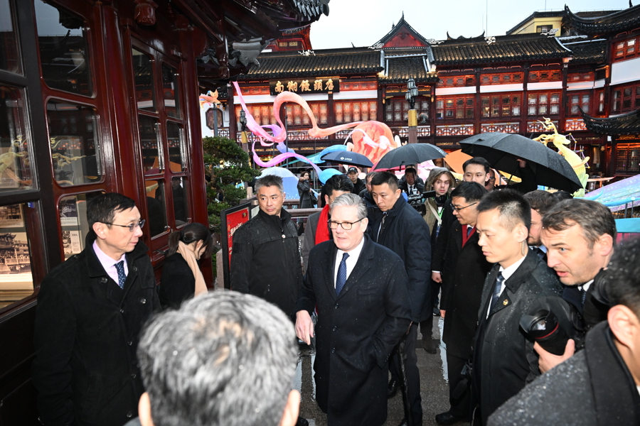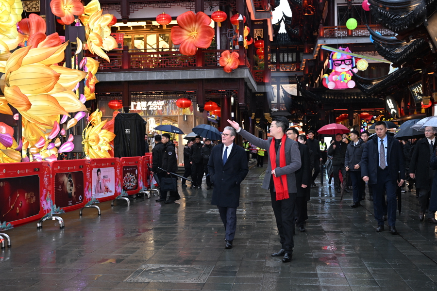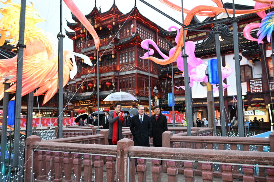 1月30日下午,天空下着细雨,英国首相斯塔默一行来到豫园,逛九曲桥,进湖心亭,与市民交流,感受中国传统文化。