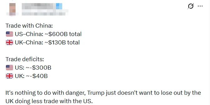 有网友直言,“这根本跟风险没有关系,特朗普只是不想因为英国减少与美国的贸易而蒙受损失。”