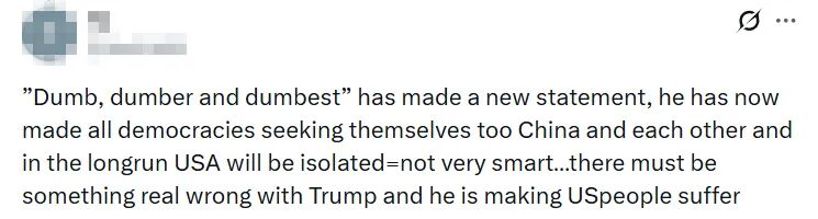 还有美国网友哀叹道,“‘无脑、更无脑、最无脑’的家伙又出惊人言论了。他正让所有国家纷纷转向中国、彼此抱团,长远来看美国只会陷入孤立,这实在太不明智了……特朗普的脑子肯定出了大问题,而他的所作所为,正让美国民众跟着遭殃。”