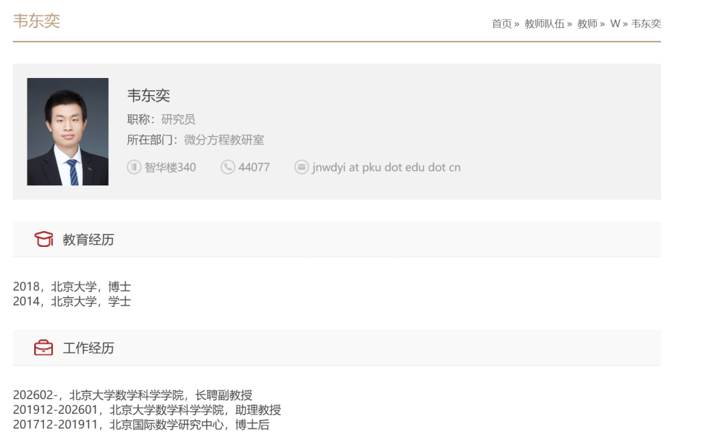 近日,北京大学数学科学学院网站教师信息更新显示,韦东奕已成为北京大学数学科学学院长聘副教授。