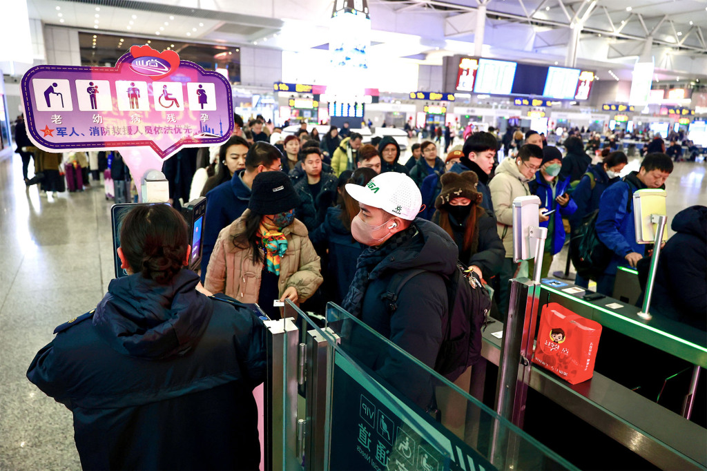 2月2日清晨6时,上海虹桥站,大批乘客检票进站。
