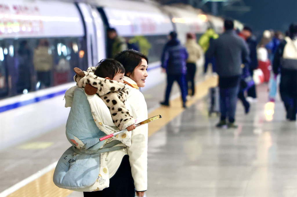 2月2日凌晨5时许,上海虹桥站,一位母亲背着自己的女儿正准备登上上海虹桥开往贵阳北站的G4021次列车。
