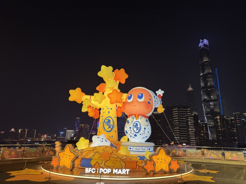 2月1日晚,记者在现场看到,BFC风尚潮流灯区联合泡泡玛特打造了新春游园会。BFC北区广场,一座宫灯旋转木马装置引人注目,在传统宫灯的朱红飞檐下,暖黄灯箱勾勒出12个泡泡玛特经典IP形象。同时,外滩枫泾路化身为“国风灯影长廊”,带来一系列喜庆欢腾的年味市集。