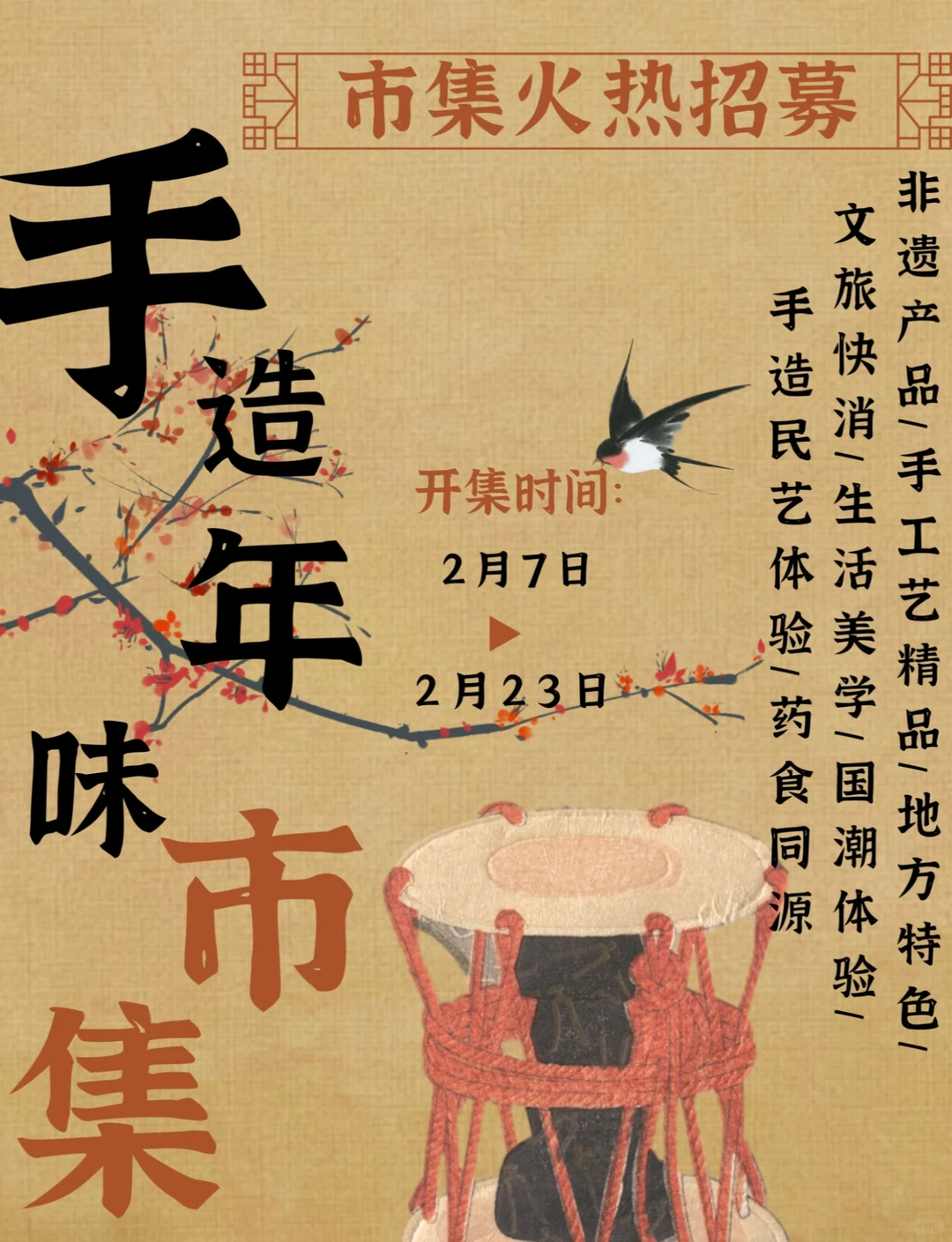 年味渐浓,手造年味市集正在招募中!2月7日至2月23日期间,将为市民游客打造一场兼具非遗特色与文化味的年味市集。