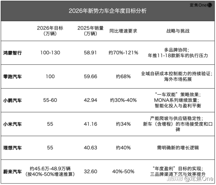 从“蔚小理”的时代,到如今“华米零”领跑的新格局,新势力的牌桌已经彻底重组。把六家新势力的2026年年度目标放在一起,更能看出各家的战略和野心。