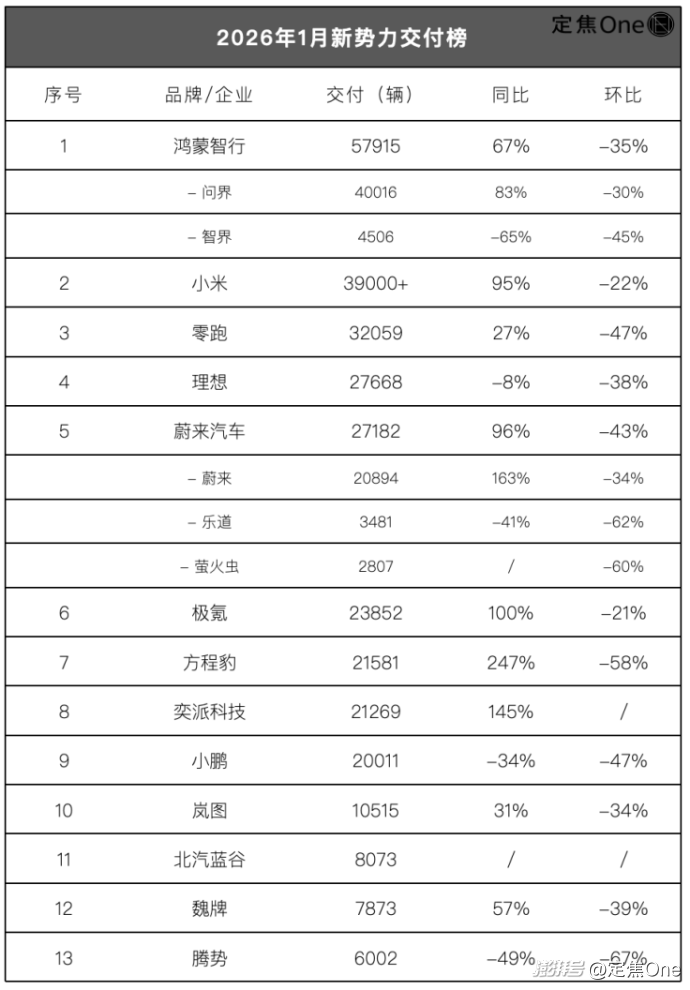2026年1月榜的前两名是两位“跨界”玩家——鸿蒙智行和小米汽车分别交付近5.8万、超3.9万。