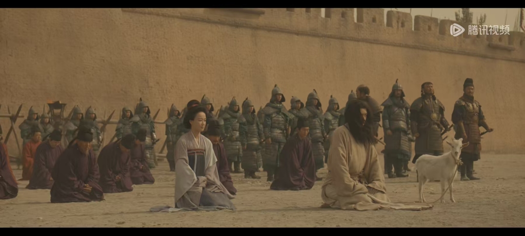 关于“牵羊礼”投降仪式,唐末渤海国主大諲撰“素服,稿索,牵羊”也就是穿着平民衣服、用草绳绑住自己或者双手,牵着羊进行投降。以石重贵在影视中表现的状态,更像是结合历史故事设计的情节,石重贵脱去冕服,换上素色的平民服装,牵着羊进行投降,跪在地上爬行,这样的设计表现是比较合理的。