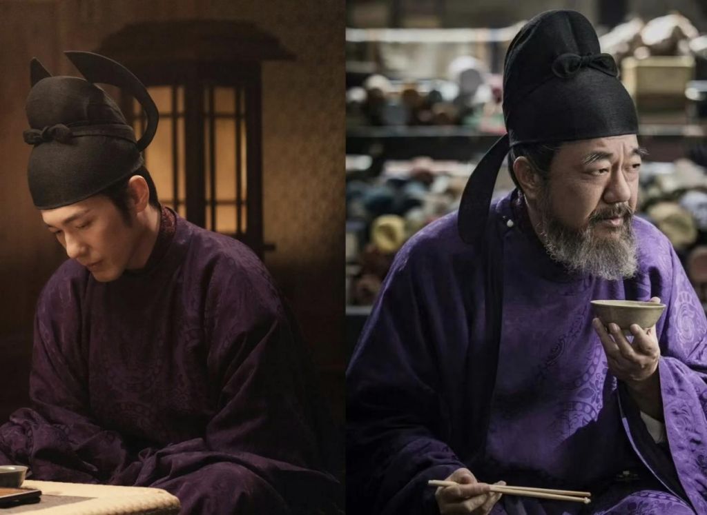 澎湃新闻:《太平年》中男性的幞头形制也很有特色,有的向下,有的高高翘起来,成为剧中很有特色的视觉景观。