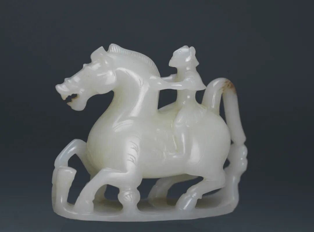 天马昂首奔腾,肋生双翼,四蹄踏于饰有流云图案的底板之上;背上羽衣仙人手持灵芝,衣袂飘扬。此器以新疆和田羊脂白玉雕成,玉质莹润,以圆雕、透雕技法为主,辅以精细线刻,工艺卓绝。有翼神兽在汉代信仰与艺术中广泛流行,人们视其为能够辟邪护佑、沟通天地的祥瑞象征。本品将天马与仙人意象完美结合,生动诠释了汉人“天马行空”的浪漫想象与“羽化登仙”的永恒祈愿,为汉代玉器圆雕中的珍罕之作。