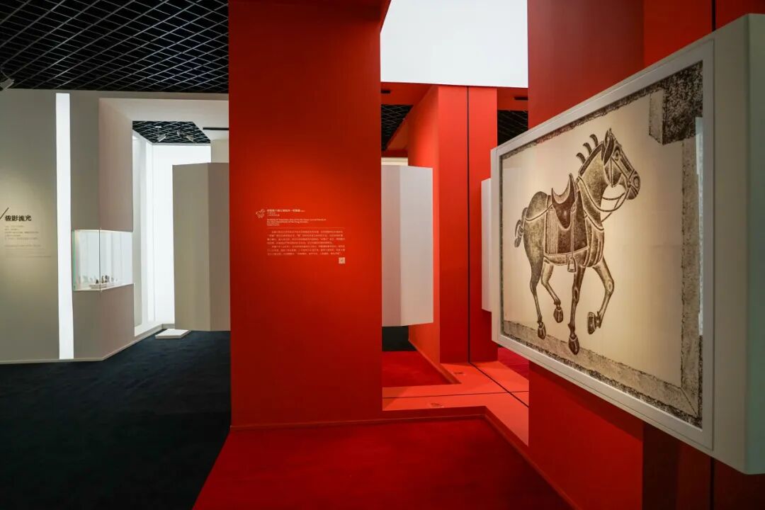 本次展厅设计利用基本形式单元的变体与重复,力图为观众带来富有特色的空间体验。展厅中心醒目的红色十字型风车结构,配合六骏的奔马形象,让历史长河中马的侧影,在环绕的动线中跃然灵动。四角的L型展墙中段镂空,形成多样的观看角度与透景效果。此外,展厅轴线尽头将两个小小的“白盒子”分置左右,为参观体验增添更多趣味。展厅整体以红黑白配色为主,彰显新春喜色,龙马精神。