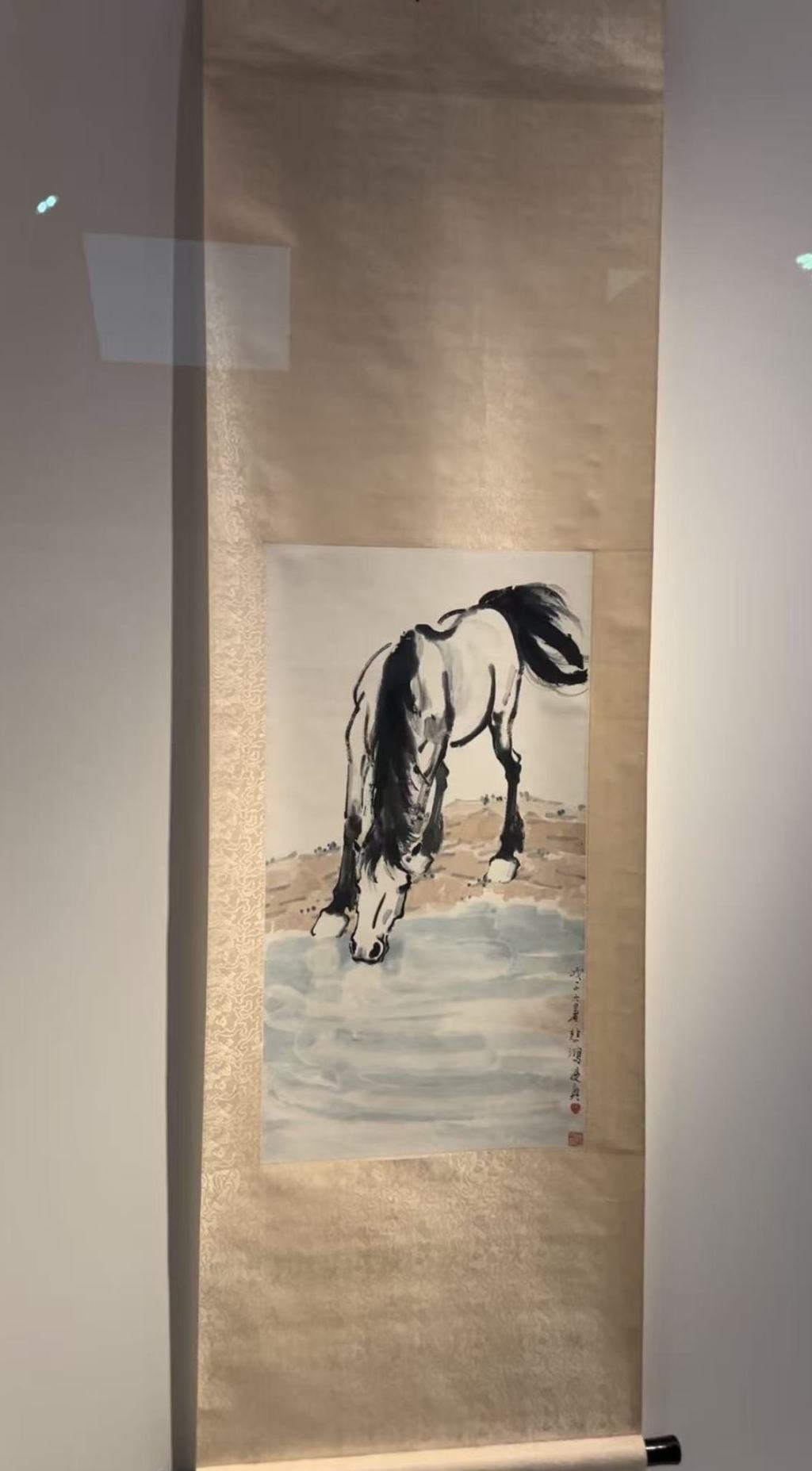 看完汉唐时期型肖逼真的战马,也可将视线移至展厅内中国近现代名家笔下的墨马。徐悲鸿《饮马图》与张大千《临曹霸玉花骢图》两幅绘画作品并列而置。《饮马图》中仅绘一只身形矫健的马在安静地低头饮水,一改徐悲鸿笔下昂扬气势的奔马形象,显得悠哉悠哉,怡然自得。《临曹霸玉花骢图》是张大千仿唐人笔意的工笔设色,画作清新古雅,神形兼备。画幅中遍地青草绿意扑面而来,令观者如沐春风。